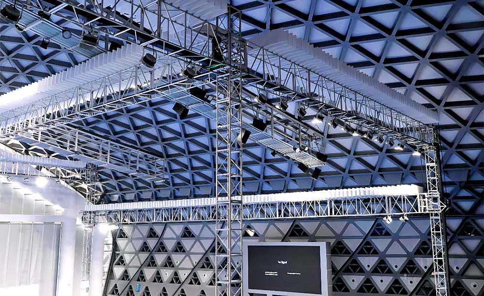 主席臺(tái)左右兩側(cè)配置LAX線性陣列揚(yáng)聲器TOP110,每組6只,共四組;主席臺(tái)側(cè)觀眾區(qū)配置每組8只,共3組.揚(yáng)聲器指向角度為水平(H)100°?垂直方向(V)10°,均勻覆蓋觀眾區(qū),保證了現(xiàn)場(chǎng)良好的聽(tīng)感效果。LAX TOP110每只揚(yáng)聲器的重量不超過(guò)25公斤,每組采用雙吊點(diǎn)吊裝,觀眾區(qū)域揚(yáng)聲器總吊裝質(zhì)量不超過(guò)350公斤。
