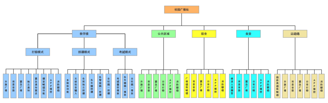 功能區(qū)域模塊化分區(qū)組合,自由編組,教室點(diǎn)對(duì)點(diǎn)廣播,預(yù)留應(yīng)急廣播系統(tǒng)。