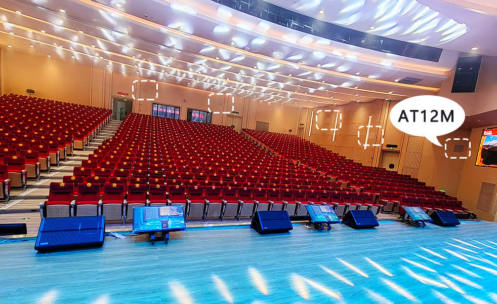 由于大禮堂場(chǎng)地面積較大,為填補(bǔ)主擴(kuò)音箱發(fā)出的聲音經(jīng)過(guò)長(zhǎng)距離后的聲壓大幅衰減,觀眾區(qū)域左右兩側(cè)各均布置3 只 LAX CS10C環(huán)繞效果揚(yáng)聲器,觀眾區(qū)域后側(cè)共均勻布置 2 只環(huán)繞效果揚(yáng)聲器LAX CS10C作為后場(chǎng)補(bǔ)聲,保證所有觀眾席都能聽(tīng)到清晰洪亮的聲音。