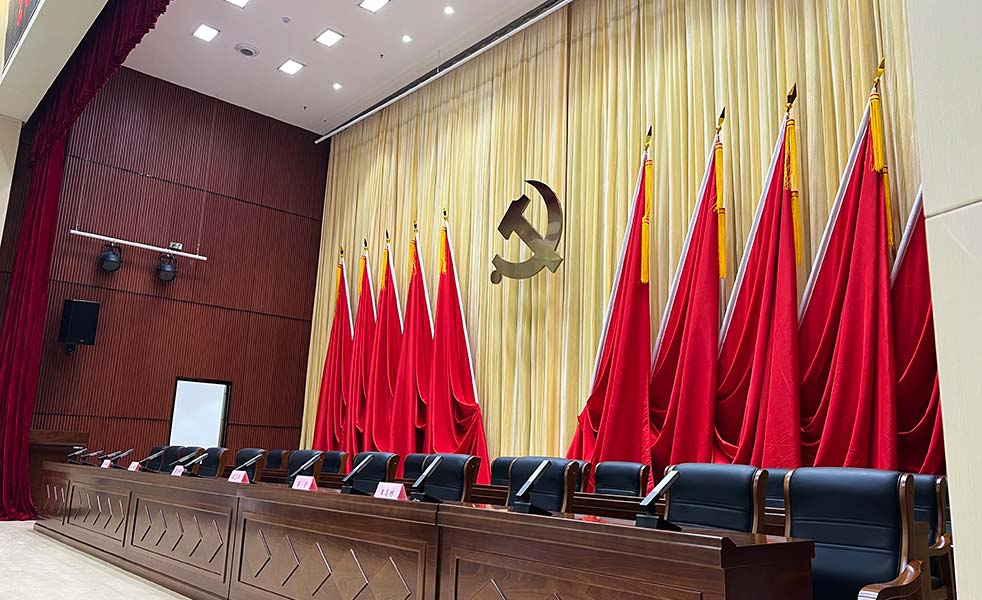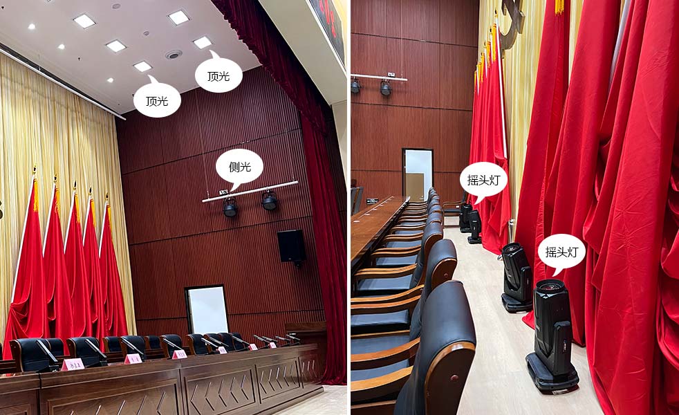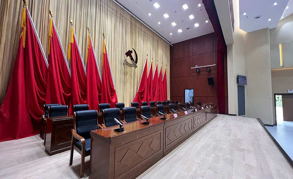 舞臺(tái)幕布由一道對(duì)開大幕、一道對(duì)開會(huì)議幕組成,達(dá)到裝飾舞臺(tái),提高演出效果的作用。