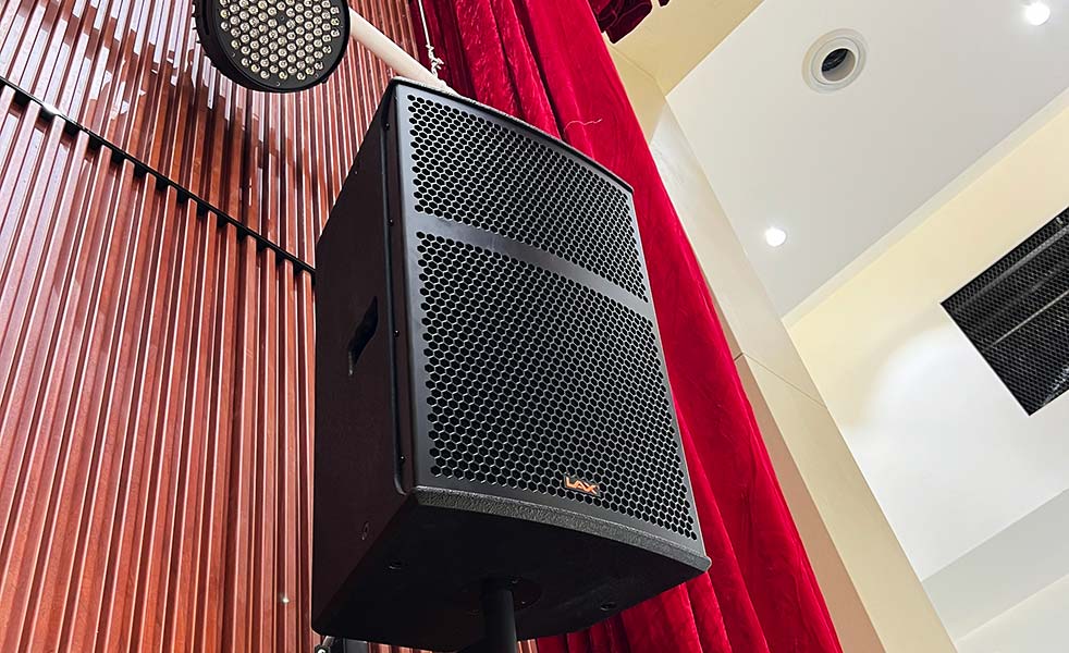 固定返聽音箱選用LAX AT12M專業(yè)返聽音箱,吊掛式安裝于舞臺(tái)內(nèi)左右兩側(cè),調(diào)整一定角度,能夠覆蓋主席臺(tái)的講話者及臺(tái)前聽眾,讓聲場(chǎng)覆蓋更加均勻。
