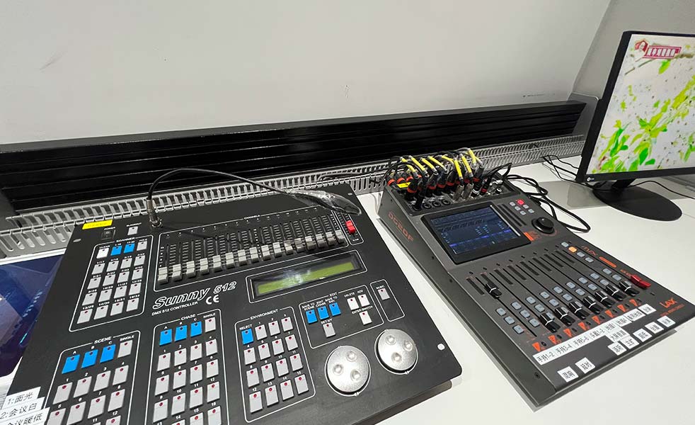 舞臺(tái)燈光系統(tǒng)由一道面光、兩道頂光、兩道測(cè)光及舞臺(tái)搖頭燈組成。