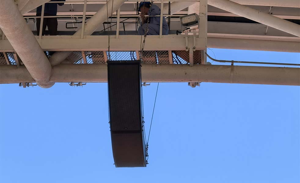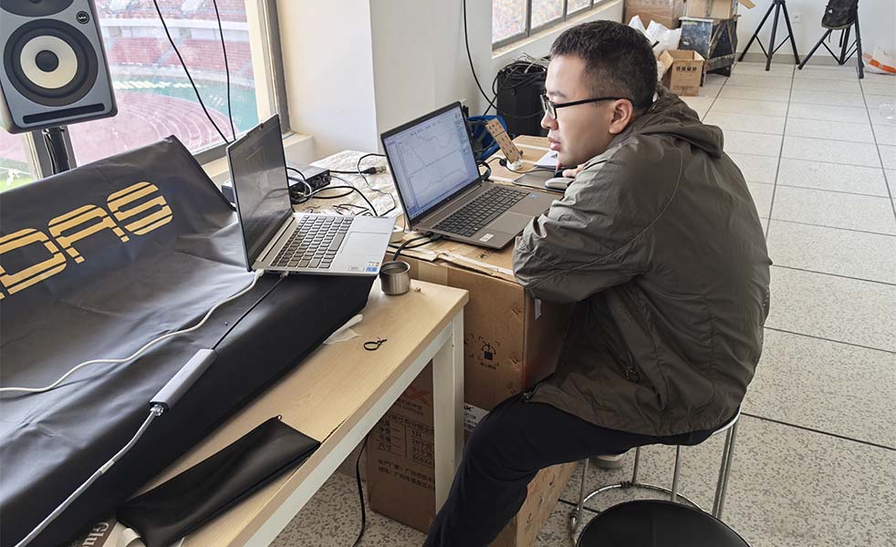 LAX總工程師趙春寧在恩賈梅納體育場實(shí)地勘測,調(diào)整揚(yáng)聲器的中高頻指向性,通過波長陣列揚(yáng)聲器在體育場館的應(yīng)用,確保聲音在場館能夠更加清晰穩(wěn)定和均勻覆蓋全場。