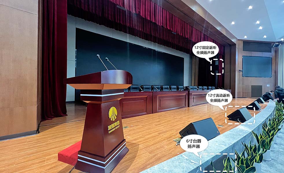 拉聲像音響選用2只12寸全頻音響,采用左右均勻布置的隱藏安裝,起到承上啟下的作用,覆蓋臺唇和主擴(kuò)聲音箱之間的銜接,解決前場觀眾因舞臺兩側(cè)音箱覆蓋角角度指向不夠所需的一種補(bǔ)充及對聲像的修正。