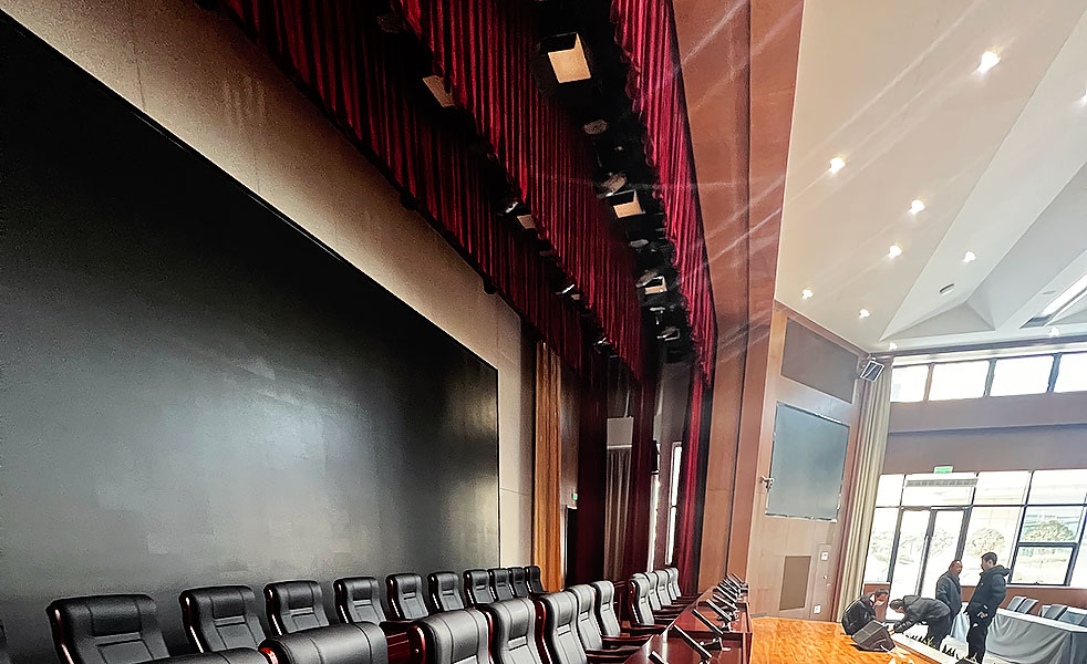 我司為本項(xiàng)目舞臺機(jī)械幕布系統(tǒng)配備:1道前檐幕、1道對開大幕、3道燈光吊桿、1道固定面光、2道橫側(cè)幕吊桿、1道景物吊桿、1道對開底幕,臺上電氣與控制系統(tǒng)。
