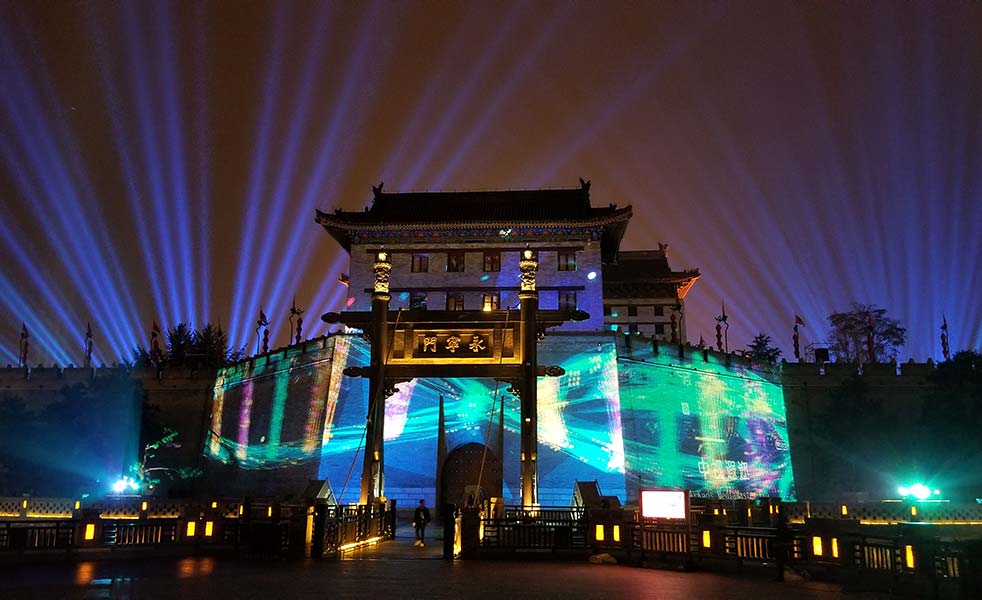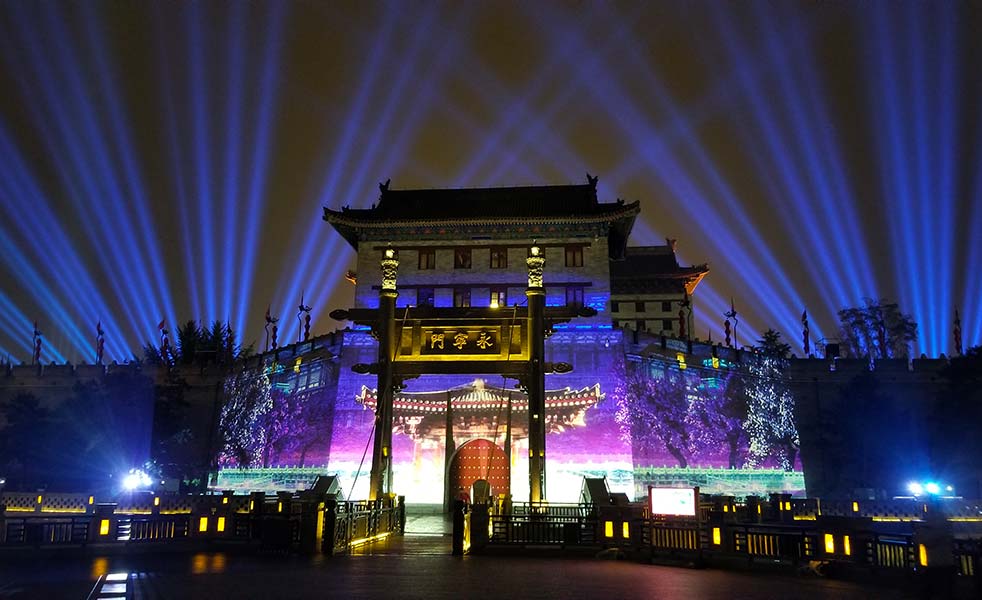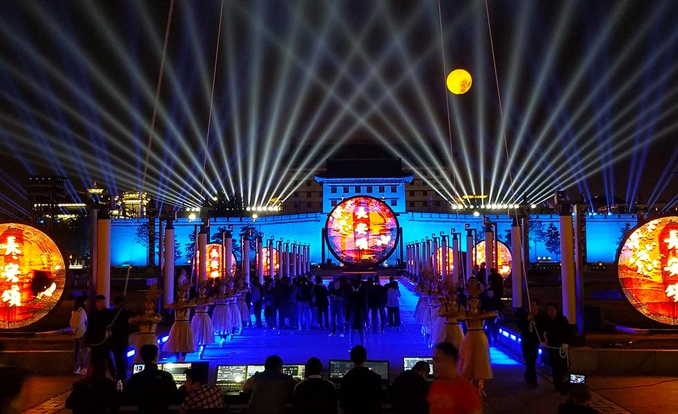 2018年國(guó)慶期間,西安永安門城墻用一場(chǎng)大型城墻光影秀《長(zhǎng)安頌》,和全國(guó)人民一起慶賀祖國(guó)69歲生日?!堕L(zhǎng)安頌》是國(guó)賓級(jí)禮儀文化演出《夢(mèng)長(zhǎng)安》的姊妹篇,依托西安的城市發(fā)展文化背景,分別展示:長(zhǎng)安城初建、十三王朝的更迭與變遷、盛世大唐的文化魅力與舞姿唐詩(shī)的風(fēng)采、絲綢之路的文明交匯、現(xiàn)代西安的城市新面貌以及西安不斷開拓進(jìn)取,不忘初心的科技發(fā)展。此次演出由LAX音響相助,全方位展現(xiàn)西安十三朝古都、三千年文化積淀的人文歷史景觀,帶領(lǐng)觀眾穿過千年之門,認(rèn)識(shí)西安、了解西安,體驗(yàn)西安城市魅力。