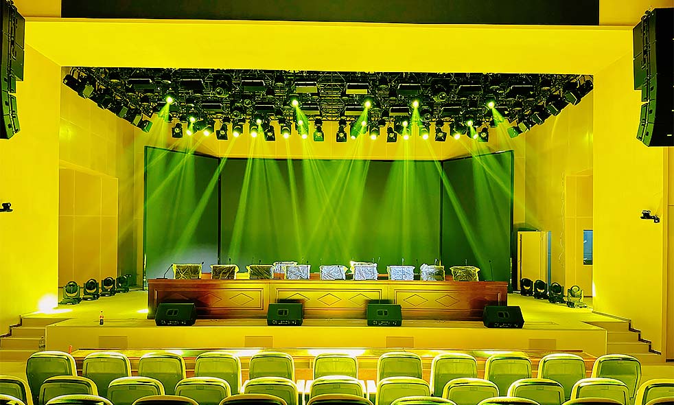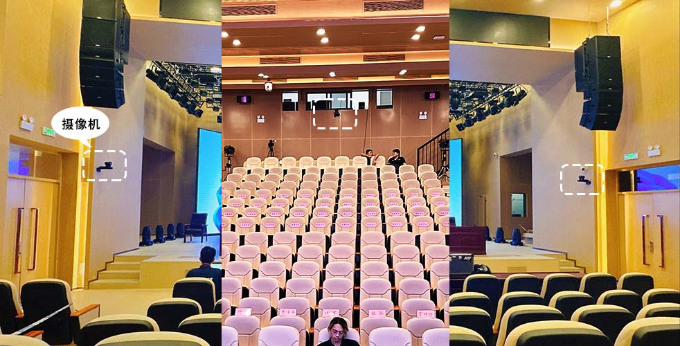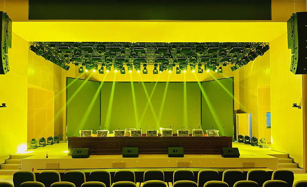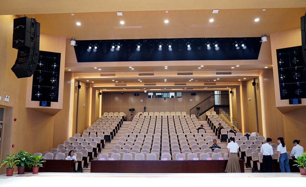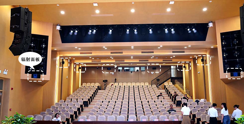 報(bào)告廳主擴(kuò)聲揚(yáng)聲器選用兩組12寸線陣音響組,每組由3只12寸全頻音響+2只18寸超低揚(yáng)聲器組成,吊掛安裝在舞臺(tái)左右兩側(cè),實(shí)現(xiàn)觀眾區(qū)的均勻聲場(chǎng)覆蓋。