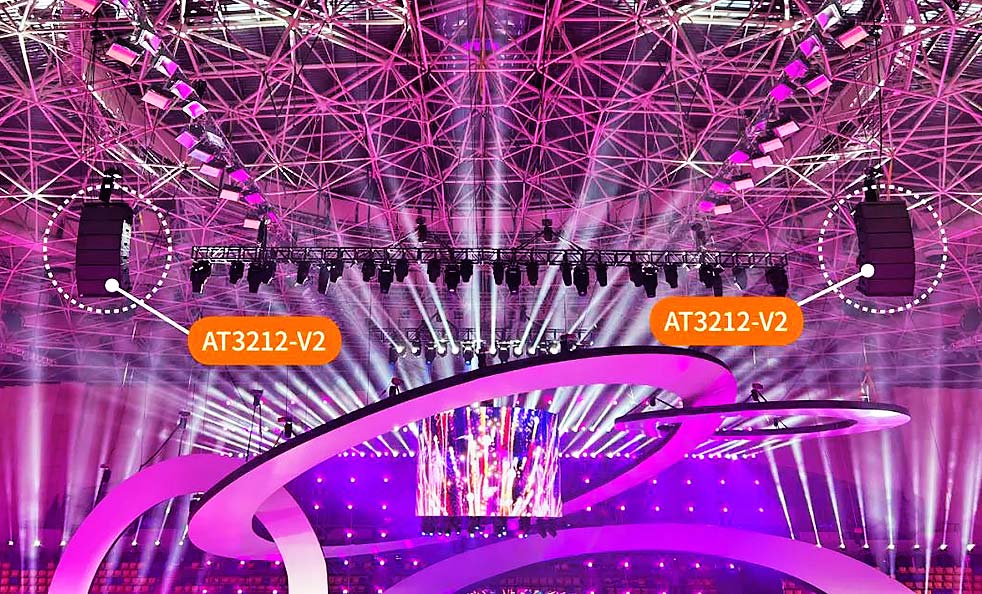 主擴分左右聲道2組,每組6只AT3212-V2線陣揚聲器,吊掛安裝并覆蓋主席臺側(cè)觀眾席區(qū)域。