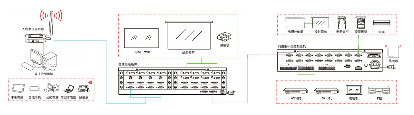 計(jì)算機(jī)系統(tǒng)包括臺式機(jī)、筆記本、服務(wù)器等,用于進(jìn)行教學(xué)、培訓(xùn)、演示以及控制。投影顯示系統(tǒng)由投影儀、視頻展示臺、投影屏幕等組成,完成展示靜態(tài)圖片或活動視頻等圖文信息的大屏幕顯示。A/V系統(tǒng)完成視音頻信號的采集、播放和切換,主要包括攝像設(shè)備(如攝像機(jī)),顯示設(shè)備(如電視機(jī)、顯示器),傳聲設(shè)備(如有線話筒、無線話筒),擴(kuò)聲設(shè)備(如功放、音箱、調(diào)音臺),播放設(shè)備(如DVD、錄像機(jī)、卡座),信號切換設(shè)備(如視音頻矩陣)等。房間環(huán)境系統(tǒng)主要指房間的可調(diào)燈光和電動窗簾等,完成對整個房間環(huán)境、氣氛的改變,以適應(yīng)當(dāng)前的需要。